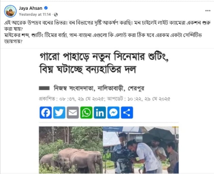কিন্তু খবরটি প্রকাশ্যে আসতেই ক্ষোভ উগরে দিয়েছেন জয়া। জঙ্গলে কেন সিনেমার শুটিং হবে? বরাবরই পশুপ্রেমী তিনি। এই বিষয়টিকে মোটেই ভাল চোখে দেখেননি অভিনেত্রী। খবরটি শেয়ার করে নিজের সমাজমাধ্যমের পাতায় জয়া লেখেন, ‘এই আর এক উপদ্রব বনের ভিতর। বন বিভাগের দৃষ্টি আকর্ষণ করছি। মন চাইলেই লাইট ক্যামেরা অ্যাকশন শুরু করা যায়? মাইকের শব্দ, গান-বাজনা এগুলো কি অ্যালাউ করা ঠিক হবে এ রকম একটা সেন্সিটিভ জায়গায়?’