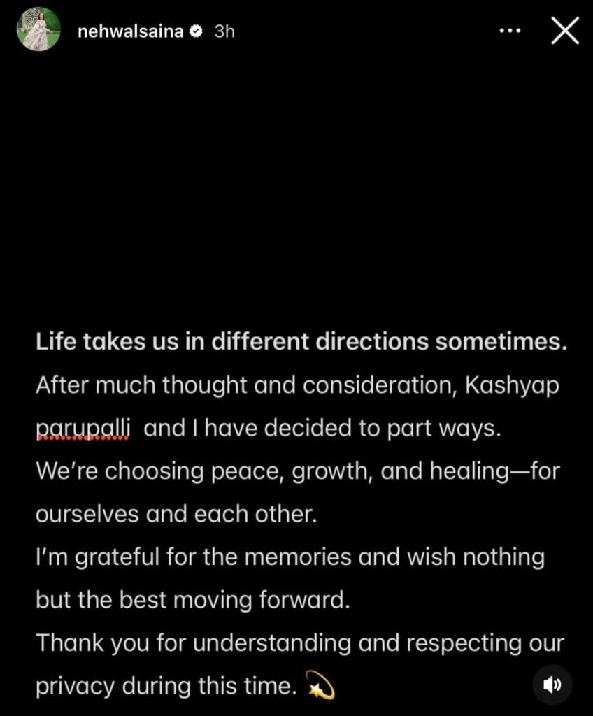 সমাজমাধ্যমেই এই বিচ্ছেদের কথা জানিয়ে পোস্ট করেন ব্যাডমিন্টন তারকা সাইনা নেহওয়াল। অলিম্পিকে ব্রোঞ্জজয়ী তারকা লেখেন, ‘জীবন মাঝে মাঝেই আমাদের অন্য পথে চালিত করে। অনেক চিন্তাভাবনার পর সম্পর্ক চ্ছিন্ন করার সিদ্ধান্ত নিয়েছে আমরা। নিজেদের জন্য ও অন্যদের জন্য শান্তি ও সমৃদ্ধি চাইছি। স্মৃতিগুলোর জন্য আমি কৃতজ্ঞ। এখন সামনের দিকে তাকানোই সেরা পথ। আমাদের বোঝার জন্য এবং গোপনীয়তাকে সম্মান জানানোর জন্য ধন্যবাদ।’ র ফলে বছরের মাঝপথেই দুই ব্যাডমিন্টন তারকার জীবনের জুটি ভাঙল। সাত বছর আগে, ২০১৮ সালে ১৪ ডিসেম্বর পারুপল্লি কাশ্যপের সঙ্গে বিবাহবন্ধনে আবদ্ধ হয়েছিলেন সাইনা নেহওয়াল।