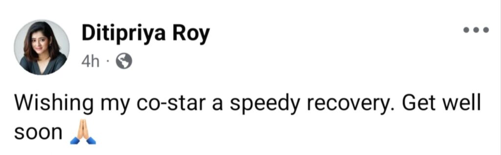 ফেসবুকে দিতিপ্রিয়া লেখেন, “প্রার্থনা করি আমার সহ-অভিনেতা তাড়াতাড়ি সুস্থ হয়ে উঠুক।” কয়েক মাস আগে প্রকাশ্যে নায়ক নায়িকার কিছু কথোপকথন ঘিরে তৈরি হয়েছিল বিতর্ক৷ তাঁদের ব্যক্তিগত কথপোকথনের স্ক্রিনশট ফেসবুকে পোস্ট করেন নায়িকা। যার ফলে বিতর্কের জল আরও ঘোলা হয়।