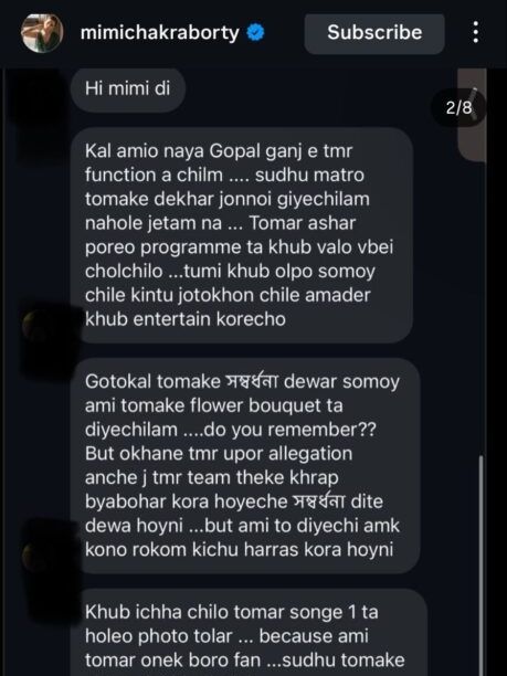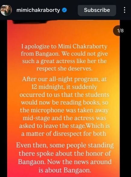 সোমবার রাত অবধি এই নিয়েই আলোচনা চলে৷ তবে মঙ্গলবার সকালে এ যেন উলটপূরাণ। নায়িকা নিজেই ইনস্টাগ্রামে ভাগ করে নিয়েছেন। ওই ঘটনার প্রেক্ষিতে তাঁর কাছে ক্ষমা চেয়েছেন উদ্যোক্তারা৷ শুধু তাই নয় সেখানে উপস্থিত থাকা ভক্তরাও নায়িকারই পাশে দাঁড়িয়েছে। সেই স্ক্রিনশটই ভাগ করে নেন মিমি।