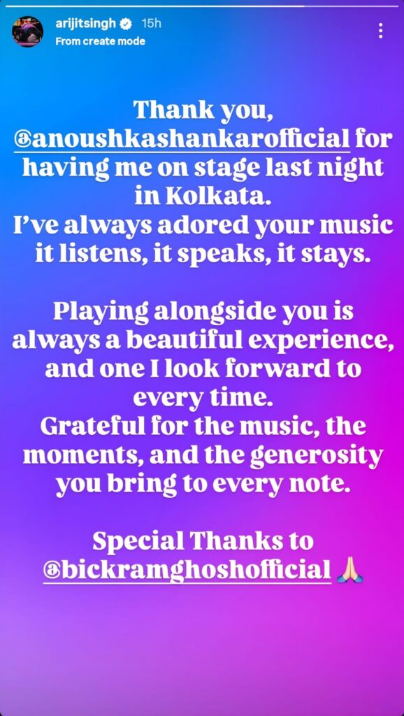 ইনস্টাগ্রাম স্টোরিতে অনুষ্কা শঙ্করের উদ্দেশ্যে অরিজিৎ লেখেন, “গতকাল রাতে কলকাতার মঞ্চে আমায় আমন্ত্রণ জানানোর জন্য ধন্যবাদ। আমি সবসময়ই আপনার সঙ্গীতকে ভালোবেসেছি। আপনার সঙ্গে পারফরমেন্স সবসময়ই আমার কাছে এক সুন্দর অভিজ্ঞতা।”