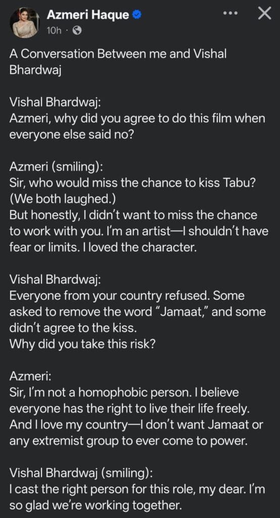 তখন পরিচালকের পাল্টা প্রশ্ন, “তোমার দেশের প্রত্যেক অভিনেত্রীই এই ছবির প্রস্তাব ফিরিয়ে দিয়েছে। কারও ‘জামাত’ শব্দটির ব্যবহার নিয়ে আপত্তি রয়েছে। আবার কেউ রাজি হয়নি তব্বুকে চুমু খেতে। তুমি এমন সাহসী দৃশ্যে অভিনয় করতে রাজি হলে কেন?”