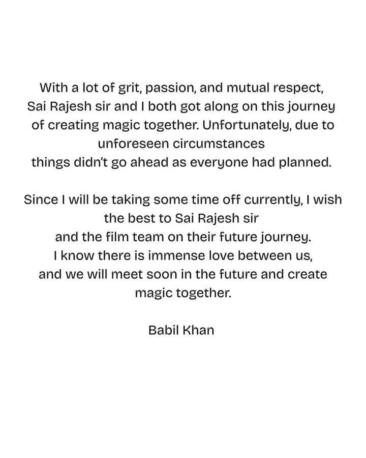 অভিনেতার এমন সিদ্ধান্তকে সম্মান জানিয়েছেন পরিচালকও। তিনি লেখেন, ‘আমার জীবনে দেখা সবচেয়ে প্রতিভাবান এবং পরিশ্রমী অভিনেতাদের মধ্যে বাবিল একজন। তবে, পরিস্থিতির কারণে এই দুর্ভাগ্যজনক বাস্তবতা আমাকে মেনে নিতেই হবে। ছবির শুরুর দিকে বাবিলের সঙ্গে সময় কাটানো এবং এমন প্রতিভাবান অভিনেতার সঙ্গে কাজ করতে পেরে আমি খুব খুশি হয়েছিলাম। আমি আমার হিরো সবসময় মনে রাখব।’ পাশাপাশি ভবিষ্যতে একসঙ্গে কাজ করার প্রতিশ্রুতিও দেন রাজেশ।