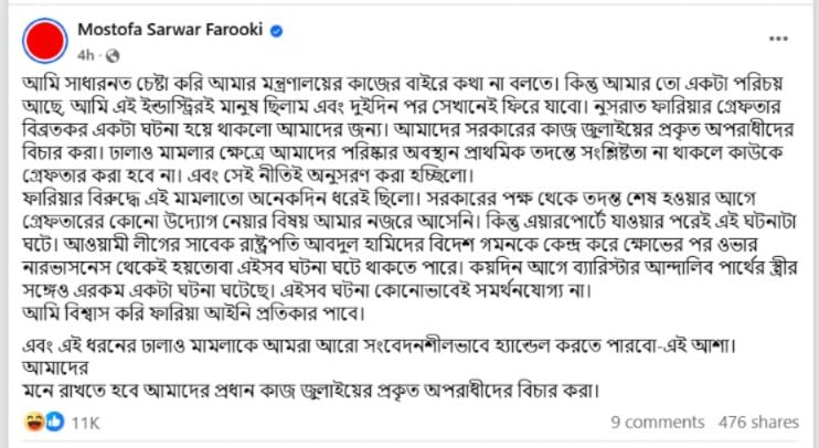 উল্লেখ্য, বাংলাদেশের সংবাদমাধ্যম সূত্রে খবর, গত বছর জুলাই মাসে গণ-অভ্যুত্থানের সময়ে নুসরতের বিরুদ্ধে হত্যার চেষ্টার অভিযোগ ওঠে। এই প্রসঙ্গেই ফারুকী লেখেন, ‘আমাদের সরকারের কাজ হল জুলাইয়ের প্রকৃত অপরাধীদের বিচার করা। ঢালাও মামলার ক্ষেত্রে আমাদের পরিষ্কার অবস্থান প্রাথমিক তদন্তে সংশ্লিষ্টতা না থাকলে কাউকে গ্রেফতার করা হবে না। এবং সেই নীতিই অনুসরণ করা হচ্ছিল।’