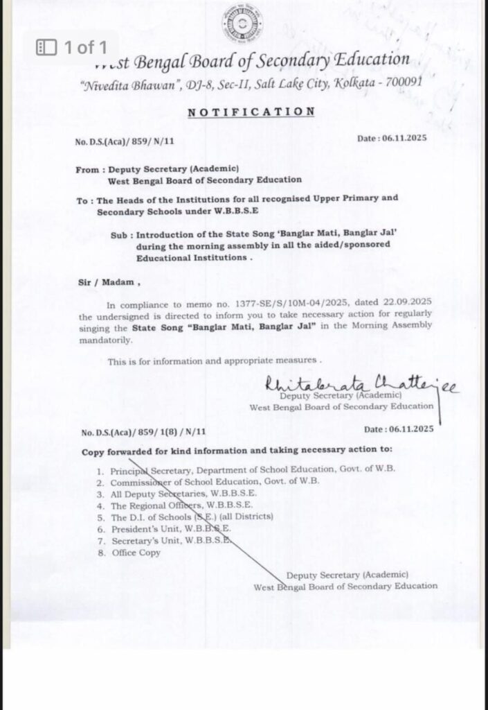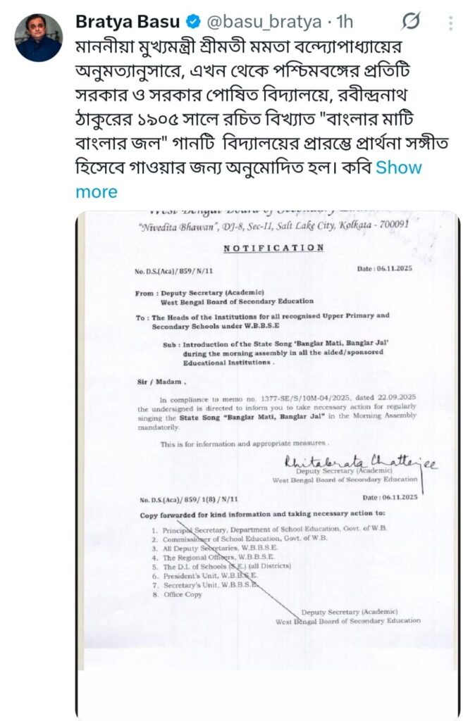 এ বার স্কুলে প্রার্থনায় গাওয়া হবে ‘বাংলার মাটি বাংলার জল’। রাজ্যের সমস্ত স্কুলে প্রার্থনার সময় রাজ্য সঙ্গীত গাওয়া বাধ্যতামূলক করা হল। এমনই বিজ্ঞপ্তি স্কুল শিক্ষা দফতরের।বলা হয়েছে যে, সব সরকারি ও সরকারি সাহায্যপ্রাপ্ত স্কুলে প্রতিদিনের প্রার্থনার সময় এই গানটি গাওয়া হবে। শিক্ষক ও শিক্ষার্থীদের উচিত হবে সকালের প্রার্থনায় গানটি সঠিকভাবে ও উচ্ছ্বাসের সঙ্গে পরিবেশন করা। এছাড়াও, পর্ষদ আশ্বাস দিয়েছে যে, স্কুলগুলো এই উদ্যোগকে সফলভাবে বাস্তবায়নের জন্য প্রয়োজনীয় দিকনির্দেশনা ও সহায়তা পাবেন। রাজ্যের মন্ত্রী ব্রাত্য বসু সমাজ মাধ্যমেও পোস্ট করেছেন। বলা হয়েছে, জাতীয় সঙ্গীত ‘জনগণমন অধিনায়ক জয় হে’র পাশাপাশি প্রার্থনা সঙ্গীত হিসেবে গাইতে হবে ‘বাংলার মাটি, বাংলা জল’ও। তাতে তিনি লিখেছেন, ‘মাননীয়া মুখ্যমন্ত্রী শ্রীমতী মমতা বন্দ্যোপাধ্যায়ের অনুমত্যানুসারে, এখন থেকে পশ্চিমবঙ্গের প্রতিটি সরকার ও সরকার পোষিত বিদ্যালয়ে, রবীন্দ্রনাথ ঠাকুরের ১৯০৫ সালে রচিত বিখ্যাত “বাংলার মাটি বাংলার জল” গানটি বিদ্যালয়ের প্রারম্ভে প্রার্থনা সঙ্গীত হিসেবে গাওয়ার জন্য অনুমোদিত হল।