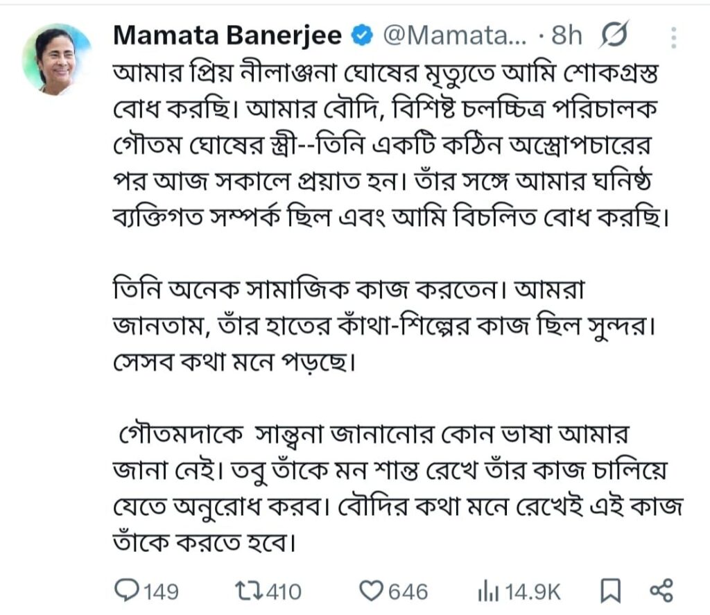 স্ত্রীকে হারালেন পরিচালক গৌতম ঘোষ, নীলাঞ্জনার প্রয়াণে শোকবার্তা মুখ্যমন্ত্রীর