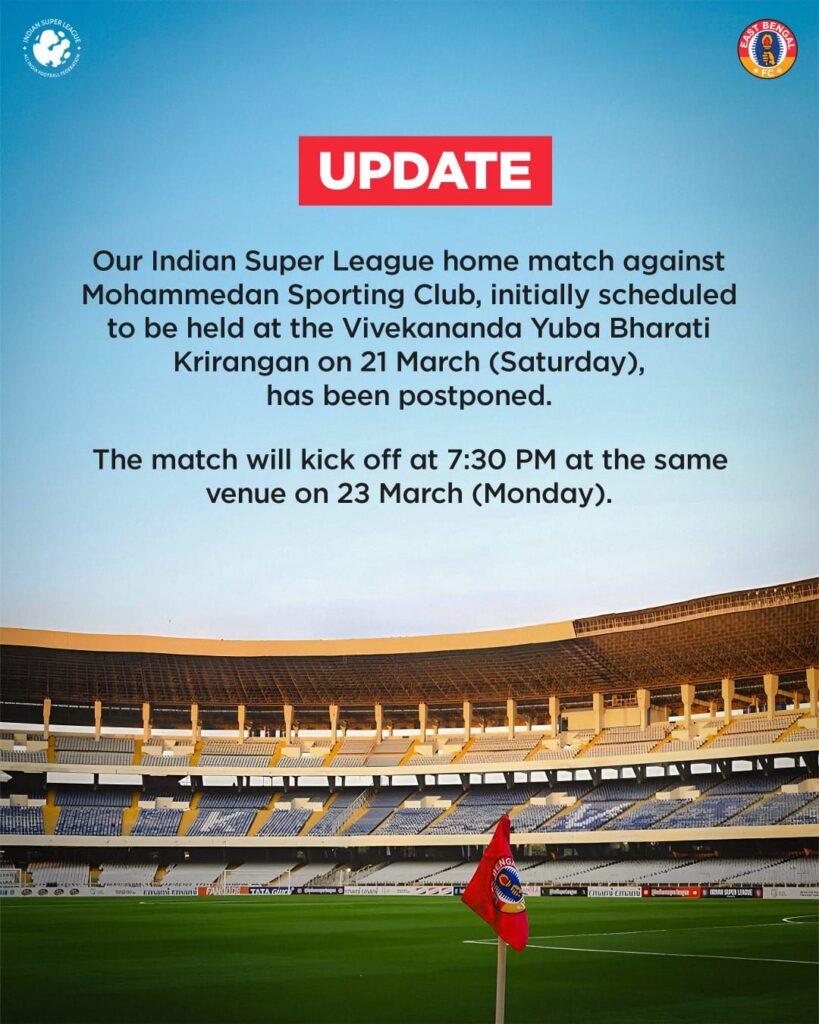 অবশেষে সূচি পরিবর্তন হল ইস্টবেঙ্গল ও মহমেডান স্পোর্টিংয়ের বহুল প্রতীক্ষিত মিনি ডার্বির। শনিবার যুবভারতী ক্রীড়াঙ্গনে ম্যাচটি হওয়ার কথা থাকলেও, ঈদের জন্য তা দু’দিন পিছিয়ে দেওয়ার সিদ্ধান্ত নিল আইএসএল কর্তৃপক্ষ। নতুন সূচি অনুযায়ী, আগামী সোমবার সন্ধ্যা সাড়ে সাতটায় অনুষ্ঠিত হবে এই গুরুত্বপূর্ণ ম্যাচ।মহমেডান স্পোর্টিংয়ের পক্ষ থেকে ঈদের দিনের কথা মাথায় রেখে ম্যাচ পিছিয়ে দেওয়ার অনুরোধ জানানো হয়েছিল। মুসলিম সম্প্রদায়ের অন্যতম প্রধান উৎসব হওয়ায় সেই আবেদন গ্রহণ করে আয়োজকরা। ফলে নির্ধারিত ২১ মার্চের পরিবর্তে ম্যাচটি হবে দুই দিন পরে।