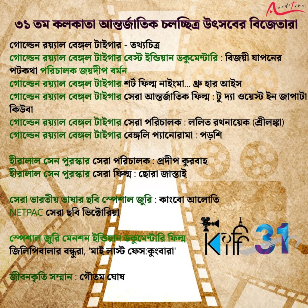 অনুষ্ঠানে মুখ্যমন্ত্রী মমতা বন্দ্যোপাধ্যায় সেরা পরিচালক হিসাবে শ্রীলঙ্কার ললিত রাথায়েক হাতে তুলে দেন গোল্ডেন রয়্যাল বেঙ্গল টাইগার পুরস্কার৷ ইন্টারন্যাশনাল কম্পিটিশন অন ইনোভেশন ইন মুভিং ইমেজেস বিভাগে ‘রিভার স্টোন’ সিনেমার জন্য এই পুরস্কার পান তিনি৷শর্ট ফিল্মে পুরস্কার জিতে নেয় নাইংমা… থ্রু হার আইস। সেরা ভারতীয় ভাষার ছবি কাংবো আলোতি, হীরালাল সেন পুরস্কার সেরা পরিচালক হন প্রদীপ কুরবাহ, হীরালাল সেন পুরস্কার সেরা ফিল্ম হয় ছোরা যাস্তাই (শেপ অফ মোমো)। NETPAC সেরা ছবি হয় ভিক্টোরিয়া, FIPRESCI সেরা আন্তর্জাতিক ছবি হয় টু দ্য ওয়েস্ট ইন জাপটা, স্পেশাল জুরি মেনশন – ভারতীয় তথ্যচিত্রের পুরস্কার পায় জিলিপিবালার বন্ধুরা,  মাই লাস্ট ফেস: কুংবারা।