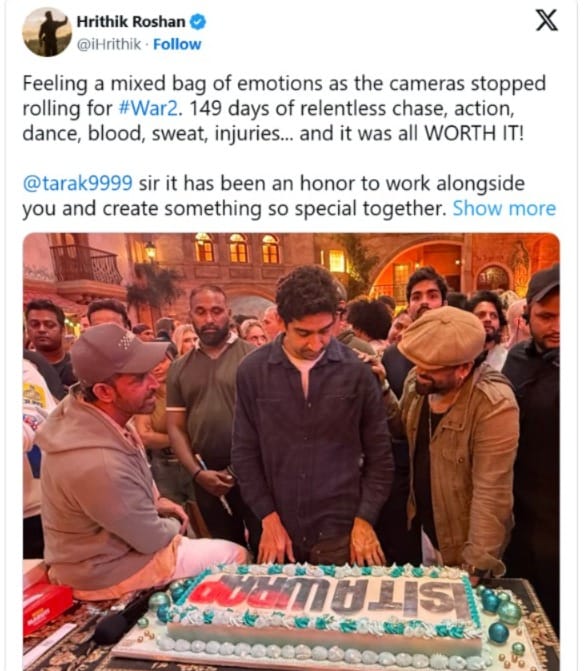 সম্প্রতি ছবির শুটিং শেষ করেছেন হৃতিক ও জুনিয়র এনটিআর। সোশ্যাল মিডিয়ায় পোস্ট করে হৃতিক জানিয়েছেন, ১৪৯ দিন ধরে টানা শুটিং চলেছে। চোট-আঘাত, নাচ-অ্যাকশন, রক্ত-ঘাম—সব মিলিয়ে এক অন্যরকম অনুভূতি। সহ-অভিনেত্রী কিয়ারা আডবানীরও প্রশংসায় পঞ্চমুখ হয়েছেন তিনি। অভিনেতা লেখেন, “তাঁর ‘লেথাল সাইড’ এ বার পর্দায় সবাইকে চমকে দেবে।”