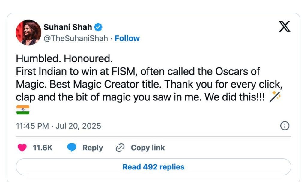 FISM পুরস্কারকে জাদুর জগতের ‘অস্কার’ হিসাবে বিবেচনা করা হয় – এবং এখন ভারত তার নিজস্ব স্থান করে নিয়েছে! সুহানি শাহ নিজেই বলেছেন, “এটি কেবল একটি ব্যক্তিগত জয় নয়, এটি ভারতের মানসিকতা, সৃজনশীলতা এবং সাংস্কৃতিক আত্মার উদযাপন।”