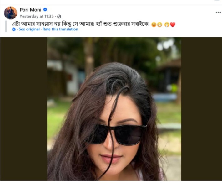 নেটপাড়া বলছে, নতুন করে প্রেমে পড়েছেন নাকি নায়িকা। তাঁর সোশ্যাল মিডিয়া পোস্টই উস্কে দিচ্ছে জল্পনা। গত শুক্রবার দুপুরে একটি ছবি পোস্ট করেছেন পরীমণি। একঢাল খোলা চুল। নেই বিশেষ রূপটান। দুই চোখ ঢাকা কালো রোদচশমায়। এখানেই চমক। ক্যাপশনে অভিনেত্রী লেখেন, ‘এই সানগ্লাসটা আমার নয়। কিন্তু সে আমার…’ তারপরে যদিও অভিনেত্রী সকলকে শুভ শুক্রবারের শুভেচ্ছা জানান। কিন্তু তার প্রথম কথাটিই যথেষ্ট অনুরাগীদের নজর কাড়ার জন্য।
