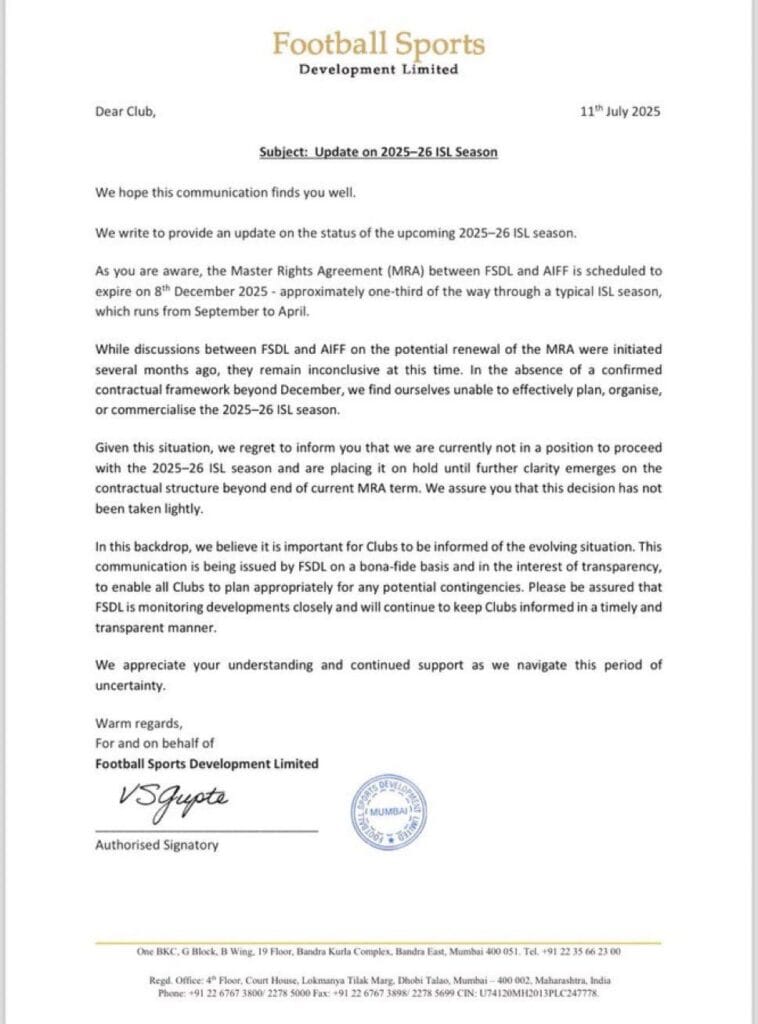 ভারতীয় ফুটবল পিছিয়েই চলেছে। ১৩৩ নম্বরে এখন। ভারতীয় ক্লাব ফুটবল অন্ধকারেই ডুবতে বসেছে। দেশের সেরা লিগ আপাতত স্থগিত! কী হবে ভবিষ্যৎ? যেটার আশঙ্কা ছিল, সেটাই হল শেষপর্যন্ত।  আইএসএলের আয়োজক সংস্থা ফুটবল স্পোর্টস ডেভেলপমেন্ট লিমিটেড (FSDL) চিঠি দিয়ে জানিয়ে দিল, এই মরশুমে আইএসএল আপাতত মুলতুবি করা হচ্ছে। চিঠি দিয়ে একথা ফেডারেশন  এবং ক্লাবগুলিকে জানিয়ে দিয়েছে এফএসডিএল।