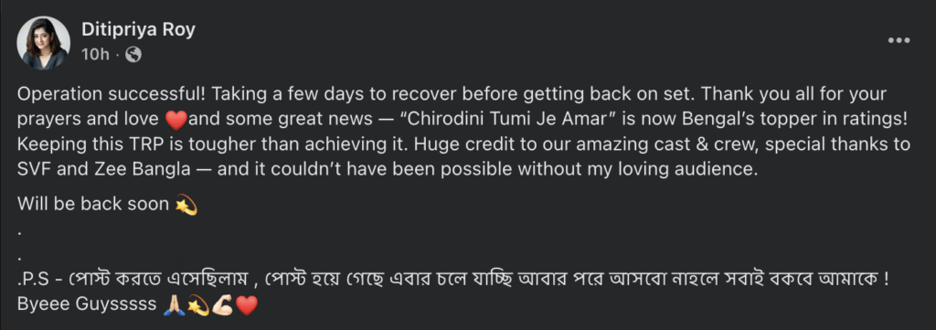অন্যদিকে ধারাবাহিকের এমন সাফল্যে খুশি দিতিপ্রিয়াও। সদ্য অস্ত্রোপচার হয়েছে অভিনেত্রীর। হাসপাতাল থেকে নিজের শারীরিক অবস্থার খবরের পাশাপাশি এই সাফল্যের জন্য নিজের দর্শককে ধন্যবাদ জানাতে ভোলেননি তিনি। দিতিপ্রিয়া লেখেন, ‘অপারেশন সাকসেসফুল! সেটে ফিরে আসতে আর কিছুদিন সময় লাগবে। তবে আপনাদের ভালবাসা আর আশীর্বাদের জন্য ধন্যবাদ। চিরদিনই তুমি যে আমার রেটিং চার্টে এখন শীর্ষস্থানে! এই টিআরপি ধরে রাখা আমাদের কাছে বিশাল বড় ব্যাপার।
