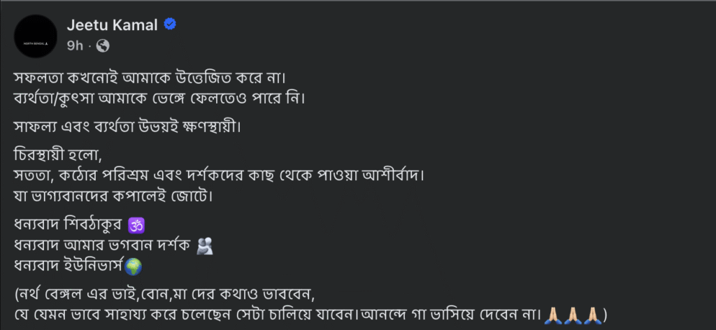 আর জীতুও আনন্দে গা ভাসাতে বারণ করে লিখেছেন,’নর্থ বেঙ্গল এর ভাই,বোন,মাদের কথাও ভাববেন। যে যেমনভাবে সাহায্য করে চলেছেন সেটা চালিয়ে যাবেন। আনন্দে গা ভাসিয়ে দেবেন না।’