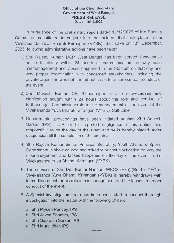 মঙ্গলবার মুখ্যসচিবের দফতর এক বিবৃতিতে জানিয়েছে, তদন্ত কমিটির প্রাথমিক রিপোর্টের ভিত্তিতে রাজ্য পুলিশের ডিজি রাজীব কুমারকে শোকজ করা হয়েছে। সেদিন কেন স্টেডিয়ামে ওই অব্যবস্থা ও গাফিলতি হয়েছিল, কেন অনুষ্ঠানের দায়িত্বপ্রাপ্ত বেসরকারি সংস্থা সহ সব পক্ষের সঙ্গে উপযুক্ত সমন্বয় ছিল না, তার কারণ দর্শাতে বলা হয়েছে ডিজিকে। ২৪ ঘন্টার মধ্যে এই শোকজের জবাব দিতে হবে তাঁকে। অব্যবস্থা ও গাফিলতির জন্য বিধাননগরের পুলিশ কমিশনার মুকেশকেও ২৪ ঘন্টার মধ্যে শোকজের জবাব দিতে বলেছে সরকার। কর্তব্যে গাফিলতি ও ওই দিনের ঘটনায় দায়িত্ব পালনে ব্যর্থ হওয়ায় বিধাননগরের ডিসি অনীশ সরকারকে সাসপেন্ড করার নির্দেশ দিয়েছে নবান্ন। এর পাশাপাশি তাঁর বিরুদ্ধে বিভাগীয় তদন্তও শুরু হয়েছে। যতদিন তদন্ত সম্পূর্ণ না হচ্ছে, তিনি সাসপেন্ড থাকবেন। ক্রীড়া ও যুব কল্যাণ দফতরের প্রধান সচিব রাজেশ কুমার সিনহাকেও গাফিলতি ও অব্যবস্থার জন্য ২৪ ঘন্টার মধ্যে শো-কজের জবাব দেওয়ার নির্দেশ দিয়েছে রাজ্য সরকার। গোটা ঘটনার তদন্তের জন্য পুলিশের একটি সিট তৈরি করে দিয়েছে সরকার। ওই কমিটিতে আছেন রাজ্য পুলিশের এডিজি (আইনশৃঙ্খলা) জাভেদ শামিম, অন্যতম শীর্ষ আইপিএস সুপ্রতিম সরকার, মুরলীধর ও পীযূষ পান্ডে। যুবভারতী কর্তৃপক্ষের বিরুদ্ধে সরকার পদক্ষেপ করেছে। সুষ্ঠুভাবে ব্যবস্থাপনা না করা ও গাফিলতির অভিযোগে স্টেডিয়ামের সিইও পদ থেকে সরিয়ে দেওয়া হয়েছে অবসরপ্রাপ্ত ডব্লিউবিসিএস আধিকারিক দেব কুমার নন্দনকে।