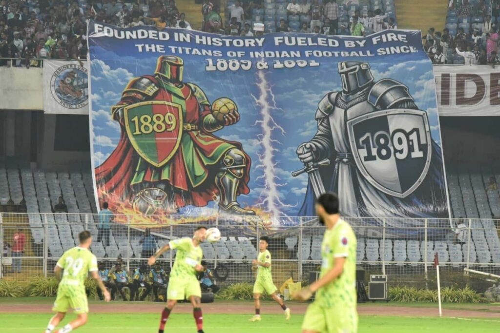 দুই প্রধানের ঐতিহাসিক গুরুত্বকে তুলে বিশেষ টিফো নিয়ে যুবভারতী ক্রীড়াঙ্গনে হাজির হয়েছিলেন দর্শকরা।তাছাড়াও আরও একটা টিফোয় লেখা ছিল, ‘প্রতিপক্ষরা দেখে নাও সব ট্রফি আমাদের হাতে’।
