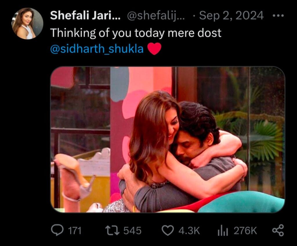 ২০২৪ সালের ২ সেপ্টেম্বর, সিদ্ধার্থ শুক্লার মৃত্যুর তৃতীয় বর্ষপূর্তিতে শেফালি জরিওয়ালা লিখেছিলেন—“আজ তোমার কথা খুব মনে পড়ছে, বন্ধু… @sidharth_shukla” সঙ্গে ছিল ‘বিগ বস ১৩’-এর সেটে তোলা তাঁদের একটি পুরনো ছবি। আজ সেই টুইটই ভাইরাল, কারণ এটাই এক্স হ্যান্ডেল তাঁর শেষ পোস্ট। কে জানত এক বছরের মধ্যেই সেই পরিণতি অপেক্ষা করে আছে অভিনেত্রীর জীবনেও।