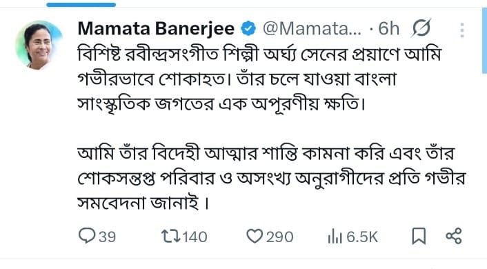 সেই অর্ঘ্য সেন সুরলোকের মায়া ত্যাগ করে চিরঘুমের দেশে পাড়ি দিলেন। বাংলার সঙ্গীতজগতে যেন মুহূর্তেই শোকের ছায়া। বেশ কিছুদিন তিনি বার্ধক্য জনিত অসুখে ভুগছিলেন। বুধবার সকালে দক্ষিণ কলকাতার বাসভবনে তিনি শেষ নিঃশ্বাস ত্যাগ করেন।