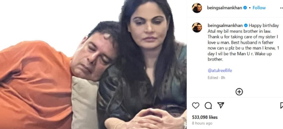 বুধবার (৯ জুলাই) নিজের ভগ্নিপতি অতুল অগ্নিহোত্রীর জন্মদিনে একটি আদুরে ছবি পোস্ট করেন সলমন খান। ছবিতে দেখা যাচ্ছে, অতুল তাঁর স্ত্রী অর্থাৎ সলমনের বোন আলভিরা খানের কাঁধে মাথা রেখে ঘুমিয়ে পড়েছেন। এই ছবির সঙ্গে ভাইজানের খুনসুটি ভরা ক্যাপশনটি নজর কেড়েছে সকলের। অভিনেতা লিখেছেন, ‘শুভ জন্মদিন অতুল, আমার বিএল মানে ব্রাদার-ইন-ল। আমার বোনের খেয়াল রাখার জন্য ধন্যবাদ। আমি তোমায় ভালবাসি বন্ধু। সেরা স্বামী এবং বাবা।”