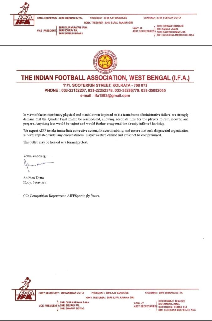 আইএফএ চিঠিতে লিখেছে, ‘সন্তোষ ট্রফি যেভাবে সম্পূর্ণ দায়িত্বজ্ঞানহীন, অসংবেদনশীল এবং নিম্নমানে আয়োজন করা হয়েছে, তার তীব্র প্রতিবাদ জানাই। খেলোয়াড়দের তীব্র শারীরিক ও মানসিক যন্ত্রণার শিকার হতে হচ্ছে। একেবারে অমানবিক পরিস্থিতি। এই ধরনের হেনস্তা একেবারেই গ্রহণযোগ্য নয়। স্থানীয় টুর্নামেন্টগুলো এর চেয়ে বেশি পেশাদারিত্বের সঙ্গে আয়োজন করা হয়। সন্তোষ ট্রফির মতো একটি মর্যাদাপূর্ণ জাতীয় টুর্নামেন্টে এমন পরিস্থিতি লজ্জাজনক। নিম্নমানের মাঠ, কম খরচার ব্যবস্থাপনায় এআইএফএফের বিশ্বাসযোগ্যতা নিয়ে প্রশ্ন তুলে দিচ্ছে। যাঁরা এই খেলার সঙ্গে যুক্ত, তাঁদের জন্য এটা চরম অপমানের। আমরা চাই, এআইএফএফ দায় বহন করে দ্রুত পদক্ষেপ নিক’।