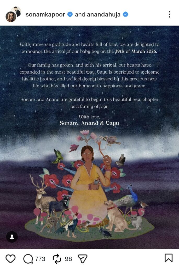 এক আবেগঘন পোস্টে সোনম লেখেন, “কৃতজ্ঞতা আর ভালবাসা নিয়ে জানাচ্ছি, আজ ২৯ মার্চ ২০২৬ আমাদের ছেলে পৃথিবীতে এসেছে।” সন্তানের আগমনে তাঁদের পরিবার আরও পূর্ণতা পেয়েছে বলেও জানান তিনি। এই নতুন অধ্যায় নিয়ে সোনম আরও লেখেন, “আমাদের পরিবার আরও বড় হল, আর ওর আগমনে আমাদের হৃদয় আরও ভরে উঠেছে। ভাইকে পেয়ে বায়ু খুব খুশি। এই ছোট্ট প্রাণ আমাদের জীবনে আনন্দ আর শান্তি নিয়ে এসেছে।” পোস্টের শেষে সোনম, আনন্দ এবং বায়ু, তাঁদের পরিবারের সকলের পক্ষ থেকেই ভালোবাসা জানান।