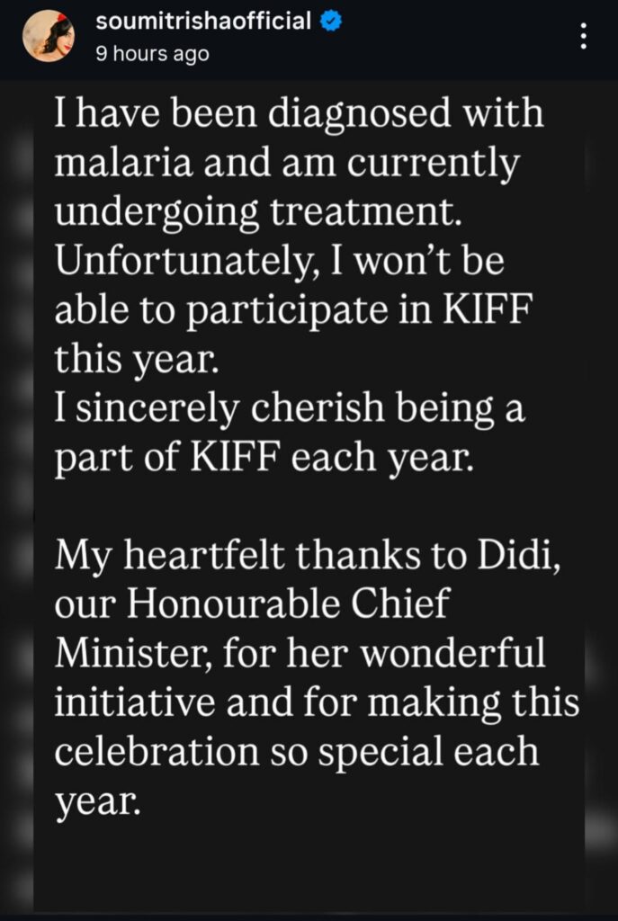 অভিনেত্রী লেখেন, “আমি ম্যালেরিয়া আক্রান্ত। চিকিৎসা চলছে। দুর্ভাগ্যবশত এই বছর কলকাতা আন্তর্জাতিক চলচ্চিত্র উৎসবে উপস্থিত থাকতে পারব না আমি। দিদি,আমাদের মুখ্যমন্ত্রীকে ধন্যবাদ জানাতে চাই প্রতি বছর এইভাবে সবটা আয়োজন করার জন্য।”