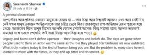 শ্রীনন্দা তাঁর প্রথম পোস্টে পারিবারিক ঐতিহ্যের কথা উল্লেখ করে লিখেছেন, ‘বংশগৌরব আর প্রতিভা একজন মানুষকে চেনায় না— তার চিন্তা আর বিশ্বাসই আসল।’ তিনি এই প্রজন্মেরই মানুষ। তাঁর কথায়, ‘এখন আর সেই দিন নেই যখন মানুষ একজন অভিনেতাকে তাঁর চরিত্র ভেবে নিতেন। তারকাদের রাগ-অভিমান এখন পুরনো হয়ে গিয়েছে। আজকের দিনে মানুষ হিসেবে আপনি কেমন, সেটাই আসল। কিন্তু সমস্যা হলো, অনেক তারকাই সময়ের সঙ্গে চলতে শেখেননি, তাই তাঁরা বিরক্ত আর তিক্ত হয়ে পড়েন।’