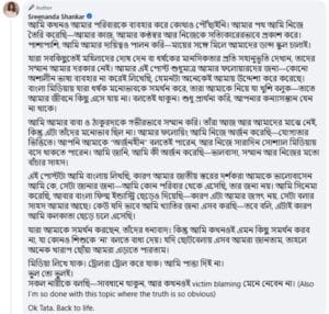 মমতাশঙ্করের ভাইঝি কিন্তু এখানেই থেমে থাকেননি। বর্ষীয়ান শিল্পী একটি সাক্ষাৎকারে জানিয়েছিলেন, কোনও নারী যদি অতিরিক্ত খোলামেলা পোশাক পরেন তা হলে তাঁকে দেখে কোনও বিকৃতকামের লালসা জাগতেই পারে। অন্য দিকে তিনি এমনও মত প্রকাশ করেছিলেন যে ছোটদের ‘গুড টাচ’, ‘ব্যাড টাচ’ শেখানোর প্রয়োজন নেই। বরং বাবা-মায়ের উচিত সজাগ থাকা। এই মন্তব্যকে কেন্দ্র করেই শ্রীনন্দা লেখেন, ‘যাঁরা সবকিছুতেই মহিলাদের দোষ দেন বা ধর্ষকের মানসিকতার প্রতি সহানুভূতি দেখান, তাঁদের সম্মান আমার দরকার নেই। আমার এই পোস্ট শুধুমাত্র আমার ফলোয়ারদের জন্য—কোনও অশালীন ভাষা ব্যবহার না করেই লিখেছি, যেমনটা অনেকেই আমায় উদ্দেশ্য করে করেছে। বাংলা মিডিয়ায় যাঁরা ধর্ষক মনোভাবকে সমর্থন করেন, তাঁরা আমাকে নিয়ে যা খুশি বলুক—তাতে আমার জীবনে কিছু এসে যায় না। বলতেই থাকুন। শুধু প্রার্থনা করি, আপনার কন্যাসন্তান যেন না থাকে।’