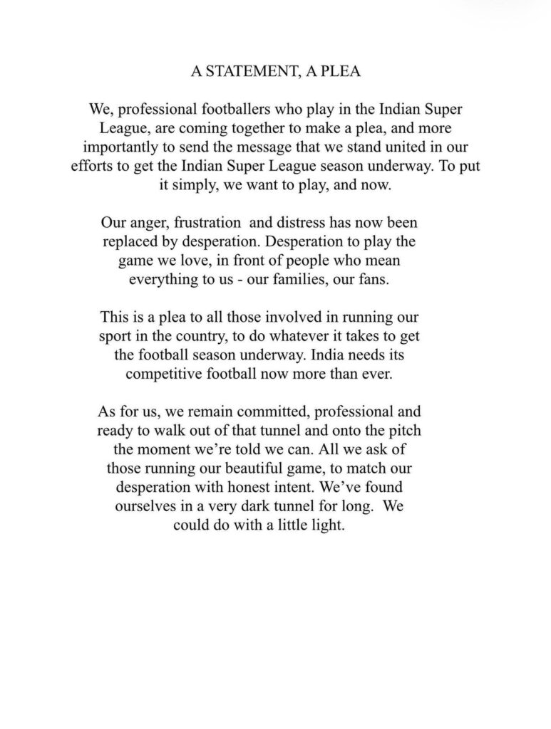 ফুটবলারদের বাড়ি চলে যেতে বলেছে এই ফ্র্যাঞ্চাইজি। ফলে ভারতীয় ক্লাব ফুটবলের ভবিষ্যৎ নিয়েও প্রশ্ন উঠে গিয়েছে। সুনীলরা আরও লিখেছেন, ‘আমাদের রাগ, হতাশা এখন বদলে গিয়েছে মরিয়া প্রচেষ্টায়। যে খেলাকে আমরা এত ভালবাসি তা খেলতে আমরা মরিয়া হয়ে উঠেছি। আমাদের দর্শক, পরিবার, সমর্থকরাই সব। যাঁরা আমাদের দেশের ফুটবল চালান এই আর্জি তাঁদের উদ্দেশে। যে ভাবেই হোক আবার আইএসএল শুরু করুন। ভারতে আবার প্রতিযোগিতামূলক ফুটবল হোক।’
