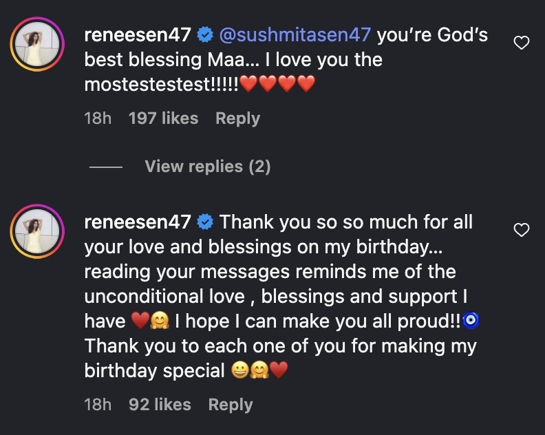 রেনের নতুন ফটোশুটের কয়েকটি ছবিও শেয়ার করেছেন সুস্মিতা। সেখানে কালো এবং প্রিন্টেড পোশাকে রেনের প্রতিটি পোজ দেখে সুস্মিতা মুগ্ধ হয়েছেন। তাঁর অ্যাটিটিউডের প্রশংসা করে লিখেছেন, ‘অ্যাটটিটিউড প্রতিযোগিতা করে না, নিজের পথেই বাজিমাত করে।’ সুস্মিতার এই পোস্টগুলো দেখে এক ভক্ত লেখেন, ‘রেনেকে দেখতে একেবারে প্রয়াত অভিনেত্রী স্মিতা পাটিলের মতো লাগছে।’ সত্যিই, রেনের মুখের সাথে স্মিতা পাটিলের চেহারার দারুণ মিল খুঁজে পেয়েছেন অনেকেই।