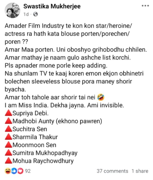এন্টারটেইনমেন্ট ডেস্ক: স্লিভলেস ব্লাউজ পরা মানেই শরীর বেচা! সম্প্রতি এমনই একটি মন্তব্যকে ঘিরে কটাক্ষে জড়িয়েছেন অভিনেত্রী শ্বেতা ভট্টাচার্য। এই মুহুর্তে তাঁকে ঘিরেই সরগরম সমাজমাধ্যমের পাতা। কটাক্ষের বাণ ছুড়েছেন অনেকেই। এরই মধ্যে এক উল্লেখযোগ্য নাম হল স্বস্তিকা মুখোপাধ্যায়। শ্বেতার নাম সরাসরি না নিয়েই নায়িকাকে একহাত নিয়েছেন স্বস্তিকা। সমাজমাধ্যমে তাঁকে ‘ছোট পর্দার অভিনেত্রী’ বলে সম্বোধন করে স্বস্তিকা লেখেন, ‘আমাদের ফিল্ম ইন্ডাস্ট্রিতে কোন অভিনেত্রীরা হাত কাটা ব্লাউজ পরতেন, পরেছেন এবং পরেন? আমার মা পরতেন, উনি অবশ্য গৃহবধূ ছিলেন। আমার মাথায় যে নামগুলো আসছে লিস্ট করছি। প্লিজ আপনাদের মনে পড়লে আরও নাম যোগ করবেন। শুনলাম টিভিতে কাজ করেন এমন একজন অভিনেত্রী বলেছেন হাতকাটা ব্লাউজ পরা মানে শরীর বেচা। আমার তো তাহলে আর শরীরটাই নেই, আমি মিস ইন্ডিয়া, দেখা যায় না। আমি অদৃশ্য।’