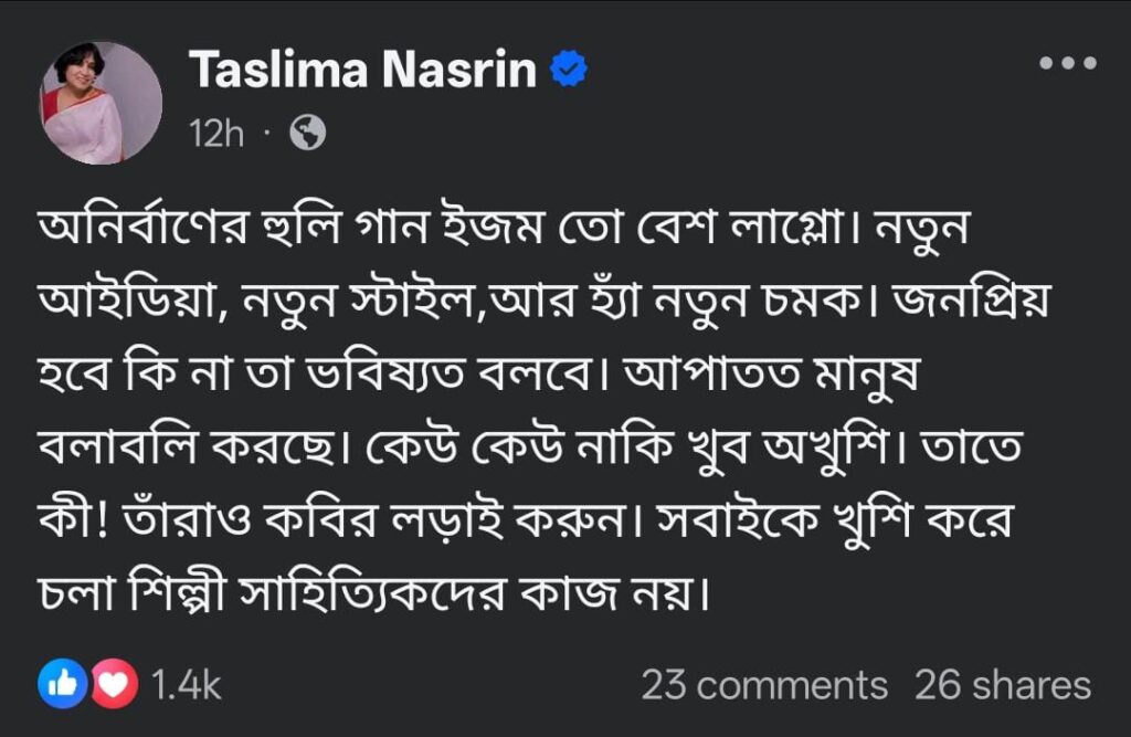 বরাবরই সমাজমাধ্যমের পাতায় সক্রিয় তসলিমা। জ্বলন্ত কোনও বিষয় নিয়েও মন্তব্য রাখতে পিছপা হন না তিনি। স্বাভাবিকভাবেই এই ঘটনা সম্পর্কেও অবগত তসলিমা ফেসবুকে লিখলেন, ‘অনির্বাণের হুলি গান ইজম তো বেশ লাগ্লো। নতুন আইডিয়া, নতুন স্টাইল,আর হ্যাঁ নতুন চমক। জনপ্রিয় হবে কি না তা ভবিষ্যত বলবে। আপাতত মানুষ বলাবলি করছে। কেউ কেউ নাকি খুব অখুশি। তাতে কী! তাঁরাও কবির লড়াই করুন। সবাইকে খুশি করে চলা শিল্পী সাহিত্যিকদের কাজ নয়।’