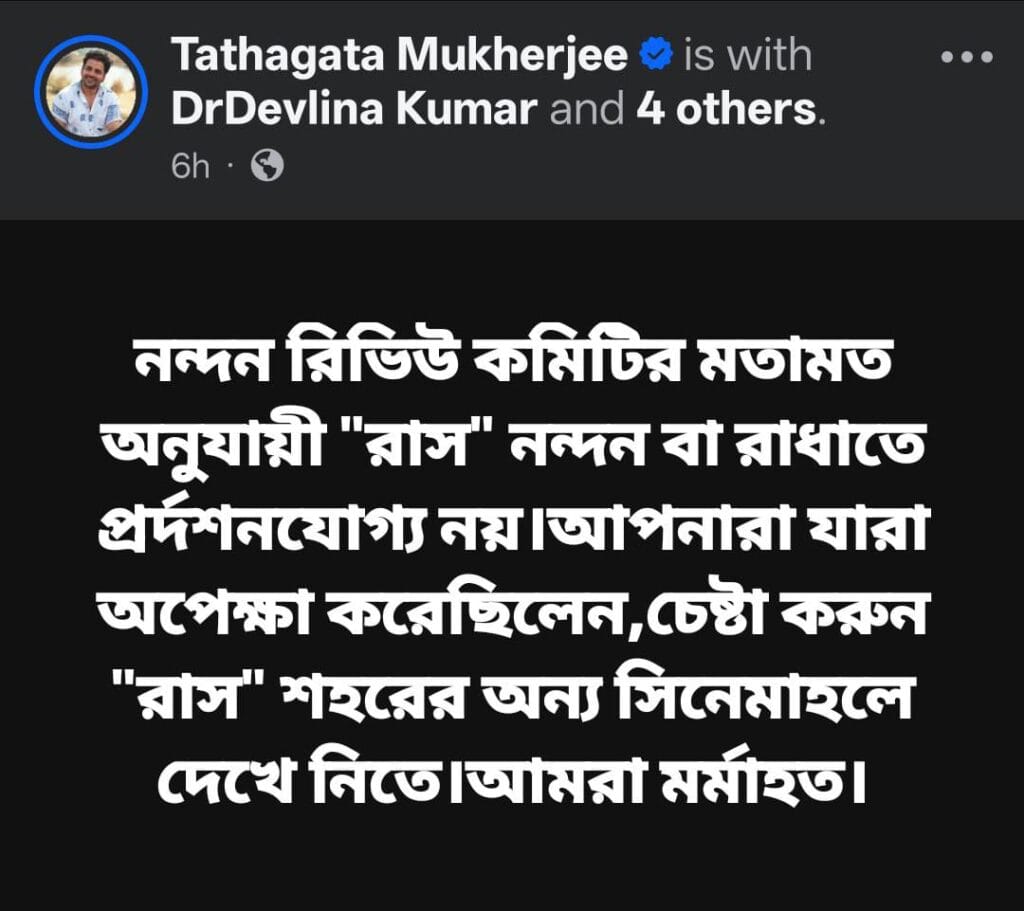 এর আগে তথাগতেরই পরিচালনায় ‘পারিয়া’ মুক্তি পাওয়ার পর প্রায় আট সপ্তাহ রমরমিয়ে চলেছিল নন্দনেই। পরিচালকের আক্ষেপ, “নন্দন এবং রাধাতে ‘রাস’ প্রদর্শনযোগ্য নয়, এটা আমার কাছে খুব আশ্চর্যের বিষয়। একজন ছবির লেখক এবং পরিচালক হিসেবে আমি স্তম্ভিত। একটা ঠিকঠাক শো টাইমিং, সরকারি সাহায্য-সবই যদি চলে যায় তা হলে আমি জানি না ছবিটা কী ভাবে মানুষের কাছে পৌঁছবে!” তিনি আরও বলেন, “শিল্পের মাধ্যমে আমি বদল আনতে চাই। কিন্তু তার জন্য শিল্পকে মানুষের কাছে পৌঁছতে দিতে হবে। আমার খুব হতাশ লাগছে।”