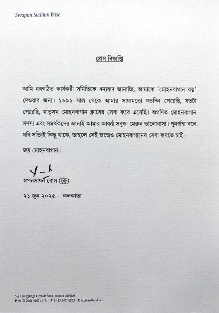 শনিবার কর্মসমিতির বৈঠকে এই বিষয়ে চূড়ান্ত সিদ্ধান্ত নেওয়া হয়। ক্লাব প্রেসিডেন্ট দেবাশিস দত্ত জানিয়ে দেন, এবারের ‘মোহনবাগান রত্ন’ টুটু বসু। নতুন সচিব সৃঞ্জয় বসু বলেন, ‘আমার বাবাকে এই সম্মানে ভূষিত করা হচ্ছে, তাই আমার পক্ষে কিছু বলা সম্ভব নয়।’ ১৯৯১ সাল থেকে ১৯৯৫ পর্যন্ত ছিলেন মোহনবাগান ক্লাবের সচিব ছিলেন টুটু বসু। তারপর ১৯৯৫ থেকে ২০১৮ পর্যন্ত ছিলেন সভাপতি। পরে ২০১৮ থেকে ২০২০-র জানুয়ারি পর্যন্ত ফের সচিব হন। আর ২০২০-২২ ও ২০২২-২০২৫, দুই দফায় ফের ক্লাব সভাপতি হন। বিদেশি প্লেয়ার সই করানো থেকে শুরু করে ব্যালট পেপারে ভোট দেওয়ার পদ্ধতি সবেতেই টুটু বসুর অবদান।