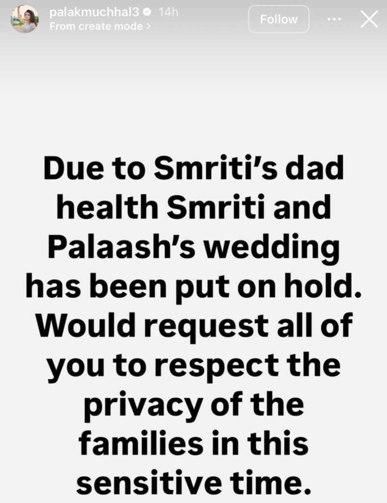 আচমকাই যেন সব কিছু ওলোটপালট হয়ে যেতে বসেছে। বিয়ের দিনই বাবা শ্রীনিবাস মান্ধানা অসুস্থ হয়ে হাসপাতালে। স্থগিত হয়ে যায় স্মৃতি মান্ধানা ও পলাশ মুচ্ছলের বিয়ে। অতিথিরা ফিরেও যায়। কিন্তু রহস্য যেন বেড়ে যায় স্মৃতি তাঁর প্রি ওয়েডিংয়ের সব স্মৃতি তড়িঘড়ি মুছে ফেলায়। আগুনে যেন ঘি পড়ে, নেটদুনিয়ায় পলাশ মুচ্ছলের সমাজ মাধ্যমে ইনবক্সের স্ক্রিনশটে অন্য এক মহিলার সঙ্গে ঘনিষ্ট চ্যাট ভাইরাল হয়ে যাওয়ায়। যেন কাহিনি অন্যদিকে মোড় নেয়! প্রশ্ন ওঠে সত্যি কি বাবার অসুস্থতার কারণেই এত আয়োজন মুহূর্তে স্থগিত হয়ে গেল? নাকি, সম্পর্কই ভাঙতে চলেছে স্মৃতি-পলাশের। নেটদুনিয়ায় নানা গুঞ্জন ছড়াতেই ইনস্টাগ্রামে ছোট্ট বিবৃতি দেন পলাশের দিদি পলক মুচ্ছল। সমাজ মাধ্যম ইনস্টাগ্রামের স্টোরিতে তিনি লেখেন, ‘স্মৃতির বাবার শারীরিক অবস্থার কারণেই স্মৃতি এবং পলাশের বিয়ে আপাতত স্থগিত করা হয়েছে। সকলকে অনুরোধ করব, এই স্পর্শকাতর সময়ে দুই পরিবারের গোপনীয়তাকে মর্যাদা দিন।’