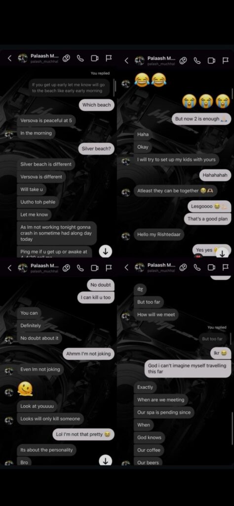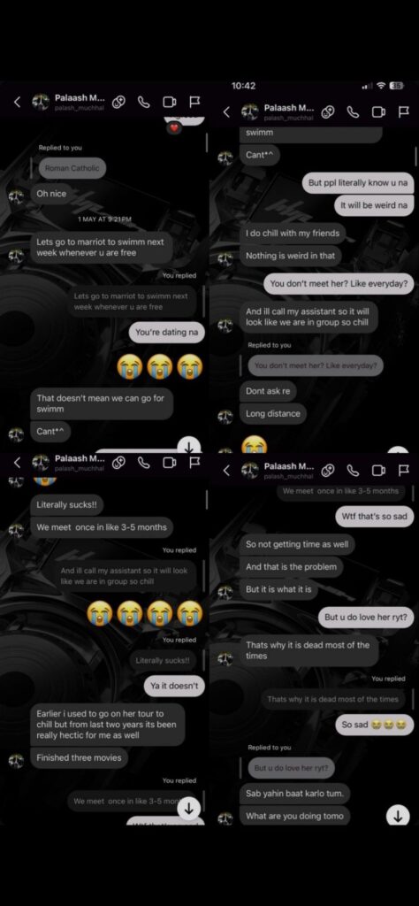 দাবি করা হয়েছে স্ক্রিনশটগুলি পলাশ মুচ্ছলের।সেই চ্যাটে দেখা যায়, ২০২৫ সালের মে মাসে পলাশ ওই মহিলাকে সাঁতার কাটতে যাওয়ার প্রস্তাব দিচ্ছেন। আর যখন মেরি প্রশ্ন করেন, ‘তুমি তো একটি সম্পর্কে আছ?’, পলাশের উত্তর আরও অনিশ্চয়তার- ‘কে বলেছে, সম্পর্কে থাকলে সাঁতার কাটা যায় না’? এইধরণের স্ক্রিনশটের সত্যতা যাচাই করেনি ‘আডিশন’। তাতেই পলাশ অন্য সম্পর্কে জড়িত বলে অভিযোগ উঠছে।