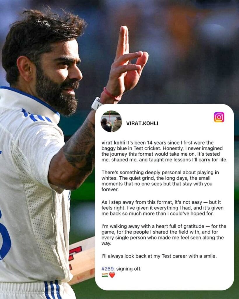 সমাজমাধ্যম ইনস্টাগ্রামে অবসরের কথা ঘোষণা করেন তিনি। কোহলি লেখেন, ‘টেস্ট ক্রিকেটে ১৪ বছর হয়ে গেল ব্যাগি ব্লু জার্সি পরেছি। সত্যি বলতে, কখনও কল্পনা করতে পারিনি এই ফরম্যাট আমাকে এতটা এগিয়ে নিয়ে যাবে। টেস্ট ক্রিকেটই আমাকে তৈরি করেছে। ক্রিকেটের এই দীর্ঘ ফরম্যাট আমাকে যে শিক্ষা দিয়েছে, তা সারাজীবনের পাথেয়।’ কোহলি আরও লেখেন, ‘সাদা পোশাকে খেলাটা একেবারেই ভিন্ন অভিজ্ঞতা। দীর্ঘ দিন ধরে এই ফরম্যাট খেলে বুঝেছি, ছোট ছোট অনেক কিছুই ঘটে যা চিরকাল সঙ্গে থাকে। এমন সিদ্ধান্ত নেওয়া সহজ নয়। তবে, ঠিক মনে হচ্ছে। আমি আমার সর্বস্ব দিয়েছি। টেস্ট ক্রিকেট আমাকে প্রত্যাশার চেয়েও বেশি কিছু দিয়েছে।