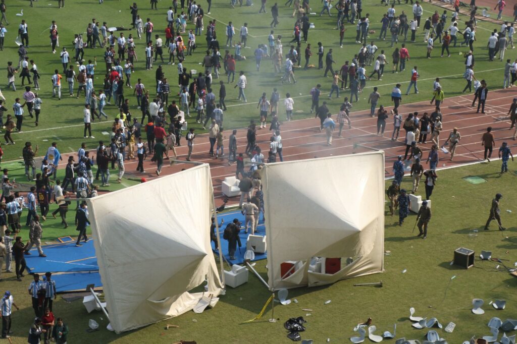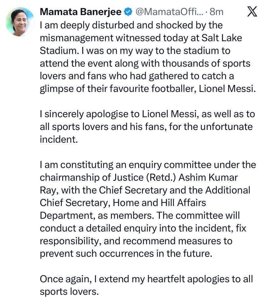 যুবভারতী ক্রীড়াঙ্গনে মেসি ম্যাসাকার। চরম বিশৃঙ্খলার ঘটনা, যুবভারতীতে তাণ্ডবলীলায় ক্ষুব্ধ মুখ্যমন্ত্রী মমতা বন্দ্যোপাধ্যায়। এই ঘটনায় তদন্ত কমিটি তৈরির নির্দেশ দিয়েছেন তিনি। মুখ্যমন্ত্রী জানিয়েছেন, ঘটনার তদন্তের জন্য কমিটি গঠন করছি।এই কমিটি গোটা ঘটনার বিস্তারিত তদন্ত করবে।যারা এই ঘটনার জন্য দায়ী তাদের চিহ্নিত করা হবে। অবসরপ্রাপ্ত বিচারপতি অসীম কুমার রায়ের নেতৃত্বে ওই কমিটিতে রয়েছেন মুখ্যসচিব মনোজ পন্থ ও স্বরাষ্ট্রসচিব নন্দিনী চক্রবর্তী। কিভাবে এই ঘটনা ঘটলো তা তদন্ত করে দেখবে এই কমিটি। ভবিষ্যতে যাতে এই ধরনের ঘটনা না ঘটে তা নিয়েও মুখ্যমন্ত্রী সতর্ক করে দিয়েছেন।